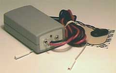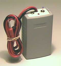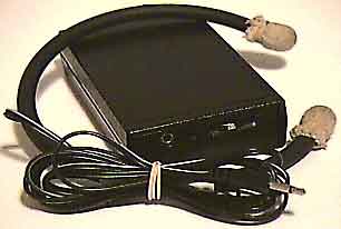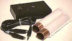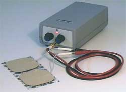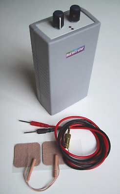 This black unit is a commercially available unit, which uses simple alligator clips, copper tubing, and simple moist cotton sleeves for contact. The gray unit show below, like many of my units use lab grade test leads with molded pins which are the appropriate size for insertion into readily available, medical grade reusable adhesive electrode pads. These provide for excellent contact and more efficient electrical transfer. Additionally, the self built unit boasts a rechargeable battery and jack so the unit does not require frequent battery replacement.