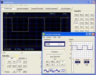 Show here is a typical screen generating a 2128 Hz square wave signal. The graphic representations on the function generator segment of this pictorial, (lower right), is an ideal representation of what the function generator he is trying to do. The SquareGEN pro oscilloscope representation is a precise and accurate depiction of what is being measured and monitored under actual load conditions. The oscilloscope controls allow the user to view the data from a variety of perspectives based on user selectable scales of time and amplitude. An analogy to a microscope would to be to allow the viewer to zoom in or out on an object with very precise control. What should be noted here for later use is the exceptionally fast “rise time” and “fall time”, (also known as “decay”). Rise time is the front edge for the square wave. The fall time is the trailing edge of the waveform. In a theoretical world, the rise time would be 0, in other words, instantaneous. Likewise, for the fall time. In practical terms however, we do not live in the theoretical world and each rise times and fall times can be measured and even displayed. The measured accuracy of the waveform, is one of the best indicators of the quality of the equipment. Proper matching of device is still another important consideration with other components is necessary to insure best performance.