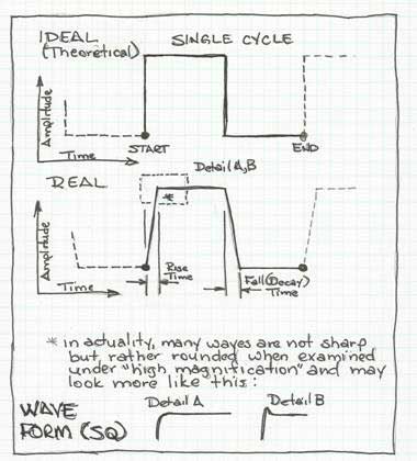 The first part of this illustration indicates an ideal or theoretical square wave form …which is basically an on an “on and off” signal. When switched on and off, the transition to the next state is theoretically immediate.